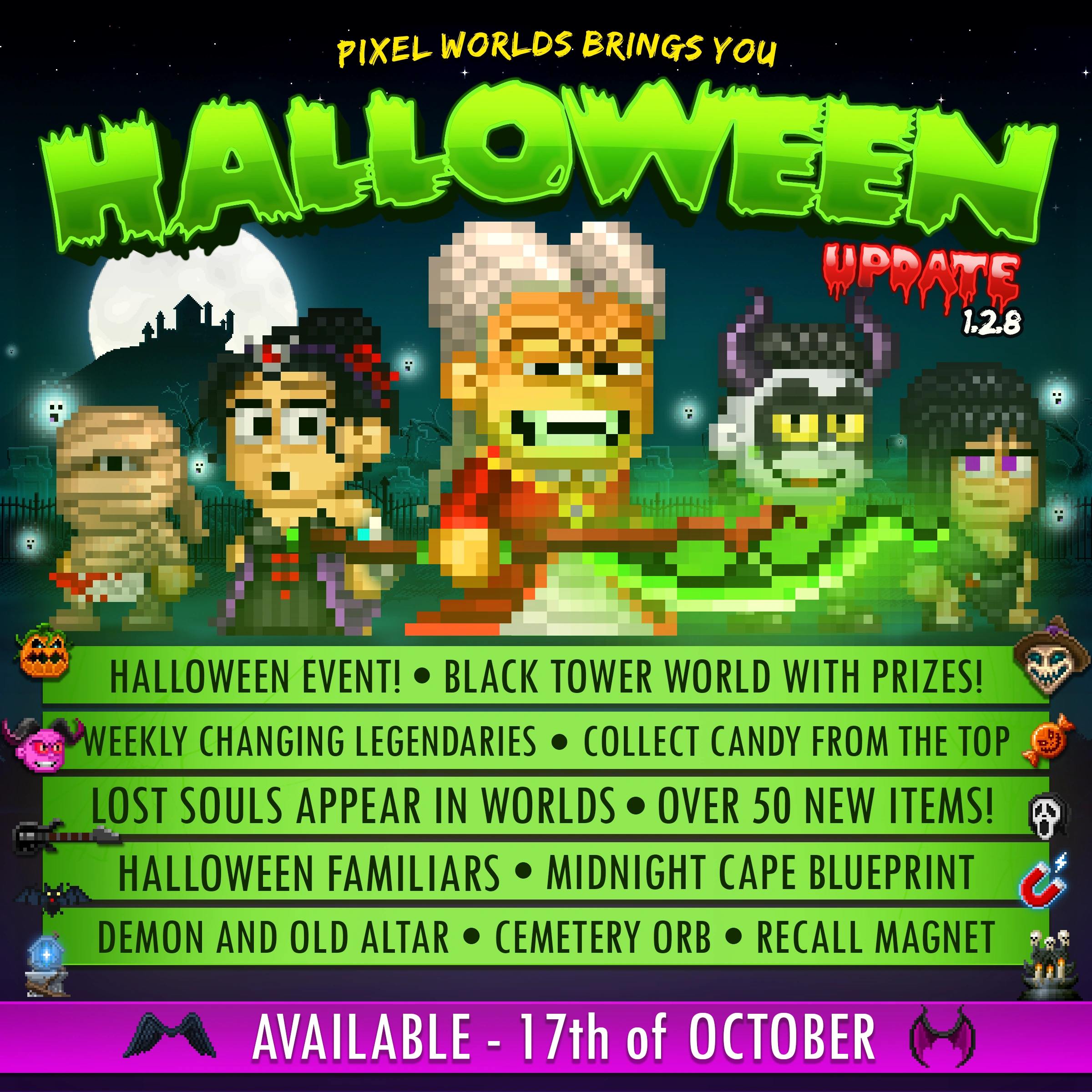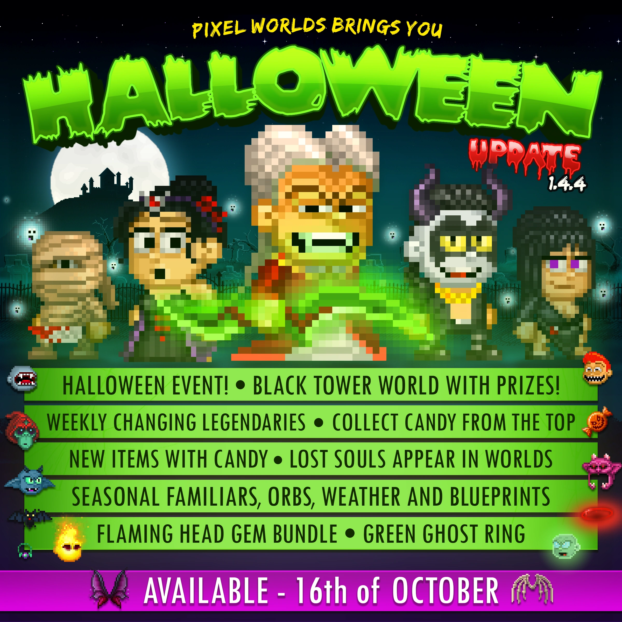 The Halloween Event is a yearly event that takes place in Pixel Worlds during the month of October for a duration of 4 weeks. During this event, players can visit the world HALLOWEENCASTLE and give 10